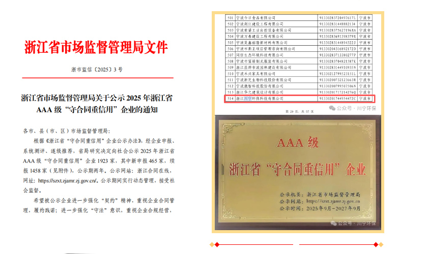 近日,浙江省市場監(jiān)督管理局發(fā)布《關(guān)于公示2025年浙江省AAA?級“守合同重信用”企業(yè)的通知》(浙市監(jiān)信〔2025〕3號),浙江川寧環(huán)??萍加邢薰驹俅纬晒θ脒x。公司自2019年7月首次斬獲浙江省守合同重信用AAA級企業(yè),2021年8月成功續(xù)評該稱號,此次2025?年再度入選。